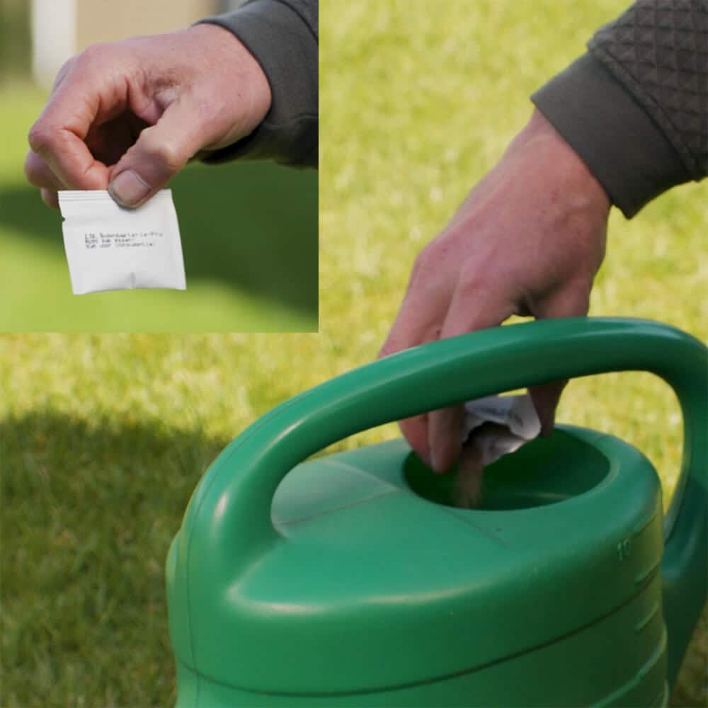 Zubereitung: Auf der Flasche heißt es dass Sie 330 ml in die Gießkanne füllen müssen. Um den Rasen zu düngen, nehmen Sie stattdessen nur 100 bis max. 150 ml. Ansonsten ist die Zubereitung genauso wie für Heckenpflanzen, also einfach einen vollen Beutel Bodenbakterie-Pro auf 10 Liter in die Gießkanne geben. Dies verteilen Sie dann mit dem Sprühkopf auf ca. 5 bis 10 m² Rasenfläche. Sie dürfen maximal einmal alle drei Wochen so düngen.